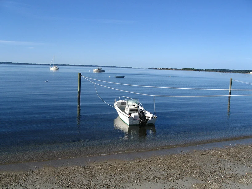 The photo above shows a boat line (also known as an outhaul). It is a beautiful set up for a small skiff which allows the boat to move with the wind and tide with minimal strain on the line. The line is reeled in to board the boat, and then reeled out to start the engine and cast off.